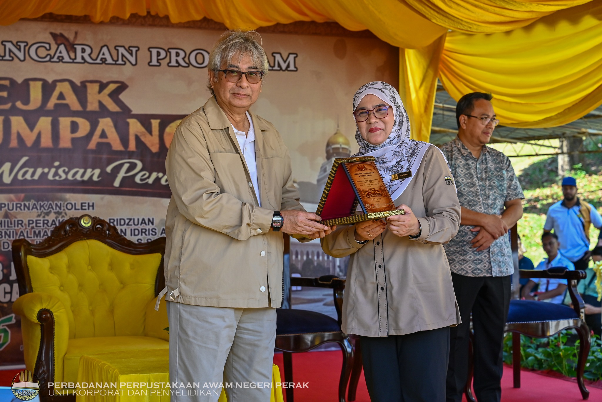Hadir sama menyantuni keberangkatan DYAM Tuanku ialah Yang Berusaha Encik Zulkafli bin Mohamed Mokhtar, Pengarah Jabatan Pendidikan Negeri Perak; Yang Berusaha Puan Rafidah binti Abdul Aziz, Pengarah Perbadanan Perpustakaan Awam Negeri Perak (PPANPk); Yang Berhormat Toh Maharaja Indera, Dato’ Dr. Khairil Anuar bin Arshad, Orang Besar Jajahan Kuala Kangsar; Yang Berusaha Encik Azrul Sani bin Ibrahim, Pegawai Daerah Kuala Kangsar; Yang Mulia Raja Kamar Azhar bin Raja Muda Ahmed Siffudin, Pengerusi Persatuan Konservasi Samudera 9 Perak; serta Yang Berusaha Dr. Sakduddin bin Zamli, Yang Dipertua Majlis Perbandaran Kuala Kangsar.